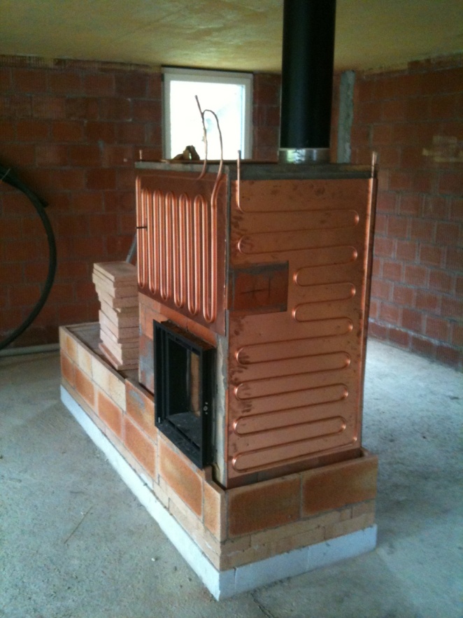 Das Wasser, welches durch den Absorber fliesst, wird dadurch erwärmt und ins Heizleitungsnetz eingespeist. Ein Absorber ist ein Platten- Wärmetauscher, welcher aus einer Platte (Aluminium, Kupfer etc.) mit einem fest darauf montierten, eng geschlauften Kupferrohr besteht. Durch das Kupferrohr fliesst ständig Wasser. Das Rohr ist dabei der eigentliche Wärmetauscher. Die Kupferplatte dient als Vergrösserung der Oberfläche des Rohrs, um dem Ofen eine möglichst grosse Wärmemenge entziehen zu können.