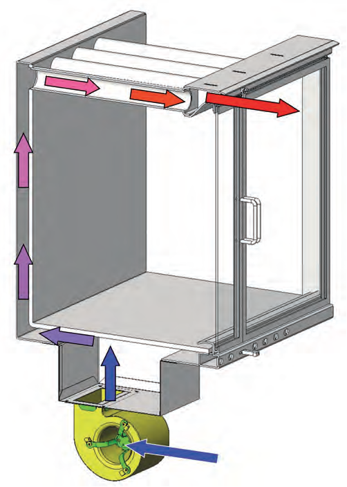 Der Ventilator saugt die kühle Luft an und führt sie durch einen Wärmetauscher im Boden, der Rückwand und in